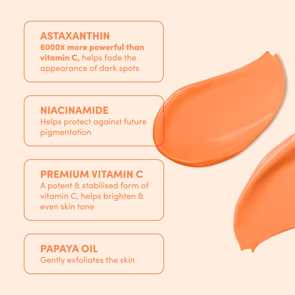 Aqua (Water), Niacinamide, Dicaprylyl Carbonate, Caprylic/Capric Triglyceride, Cetearyl Alcohol, Propanediol, Betaine, Carica Papaya (Pawpaw) Seed Oil, Cetearyl Glucoside, Hydroxyethyl Acrylate/Sodium Acryloyldimethyl Taurate Copolymer, Cetearyl Olivate, Sorbitan Olivate, Ascorbyl Tetraisopalmitate (Vitamin C), Haematococcus Pluvialis (Green Microalga) Extract, Simmondsia Chinensis (Jojoba) Seed Oil, Tocopherol (Vitamin E), Helianthus Annuus (Sunflower) Seed Oil, Distarch Phosphate, Citric Acid, Sodium Citrate, Sodium Phytate, Potassium Sorbate, Benzyl Alcohol, Ethylhexylglycerin, Parfum, Citrus Aurantium (Orange) Peel Oil, Citrus Limon (Lemon) Peel Oil, Limonene.