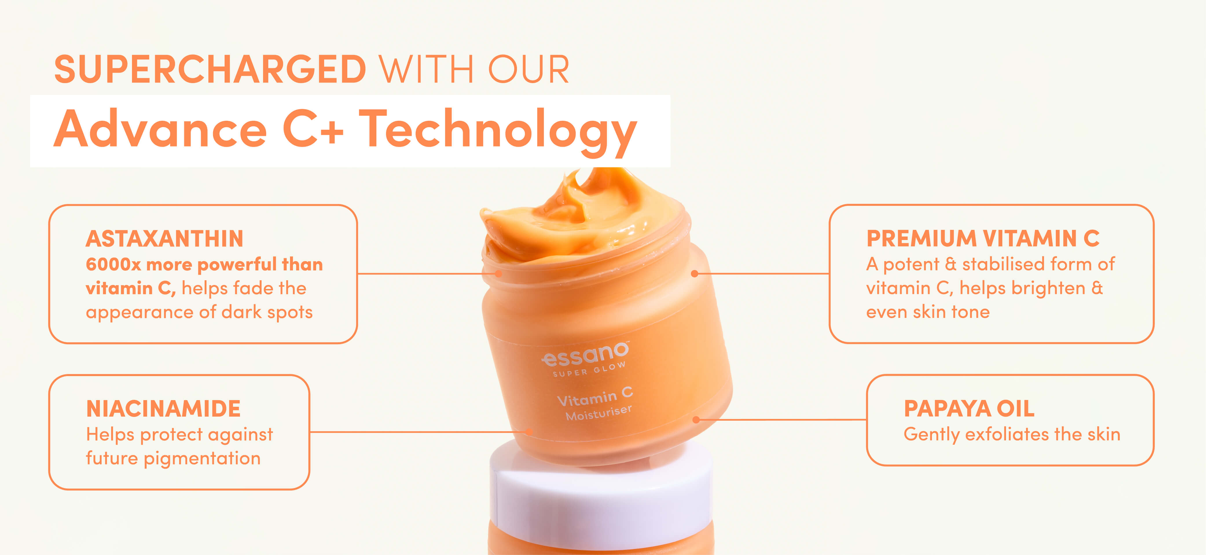 The nitty-gritty: Say hello to our Advance C+ Complex, ¹ your new skincare hero. Featuring astaxanthin (an antioxidant that’s 6000x stronger than regular vitamin C—yes, SIX THOUSAND), this moisturiser is here to fight dark spots and hyperpigmentation like an elite skincare bodyguard.